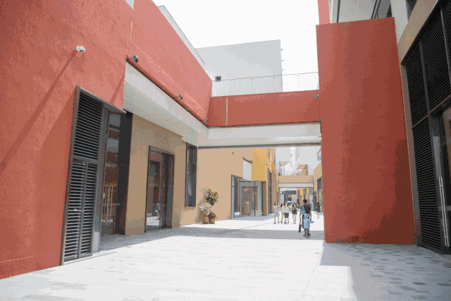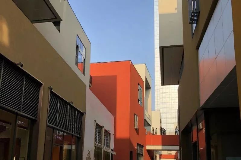 小镇上的建筑错落有致地排布每幢建筑的外墙均被涂上黄、红、橙大块暖色调,简约而富有美意