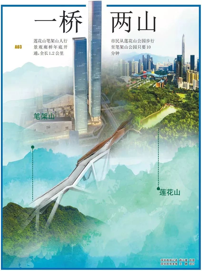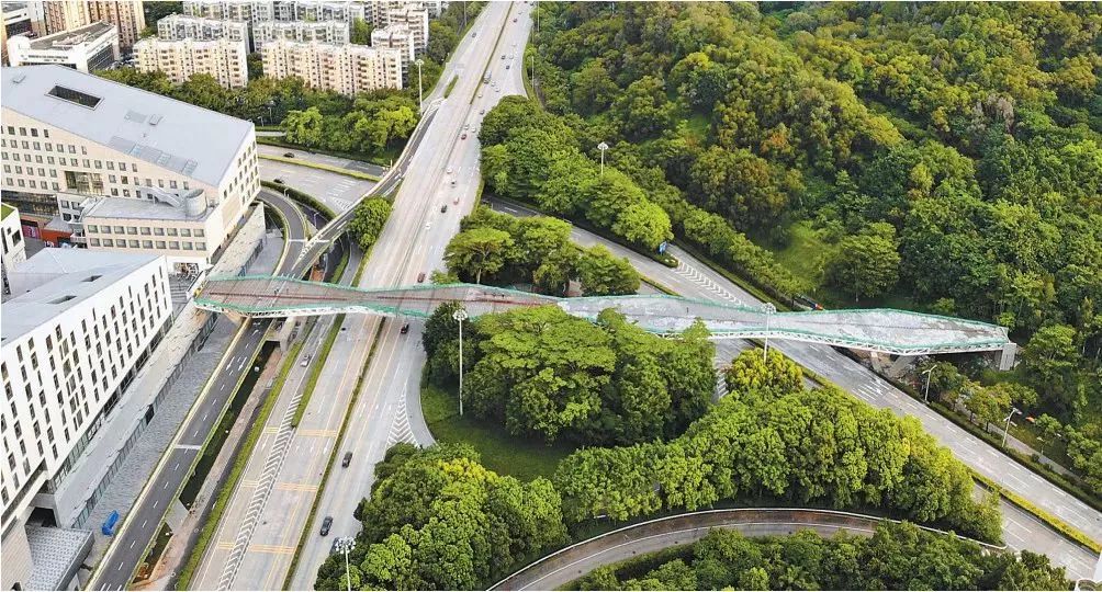 “空中廊桥”全长共1.2公里,连接莲花山公园和笔架山公园,由于地面机动车交通流量大。以往要在两座公园间穿行十分不便如今步行仅需10分钟!