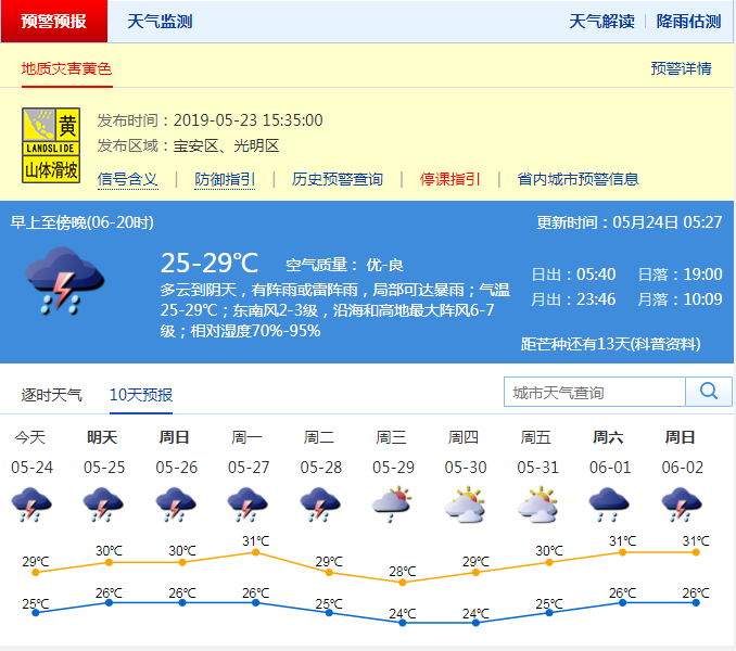 深圳新闻网2019年5月24日讯 昨日,光明区和宝安北部等出现了暴雨局地大暴雨。市气象台预测,今日局部仍有暴雨,并伴有雷暴,市民外出注意采取相应防御措施。