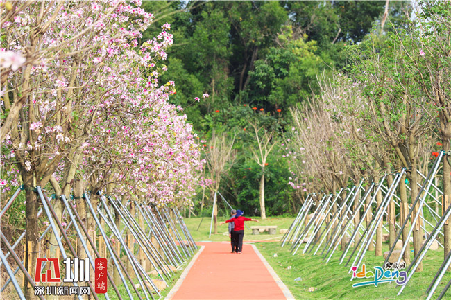 游人行走在种满宫粉紫荆的绿道上